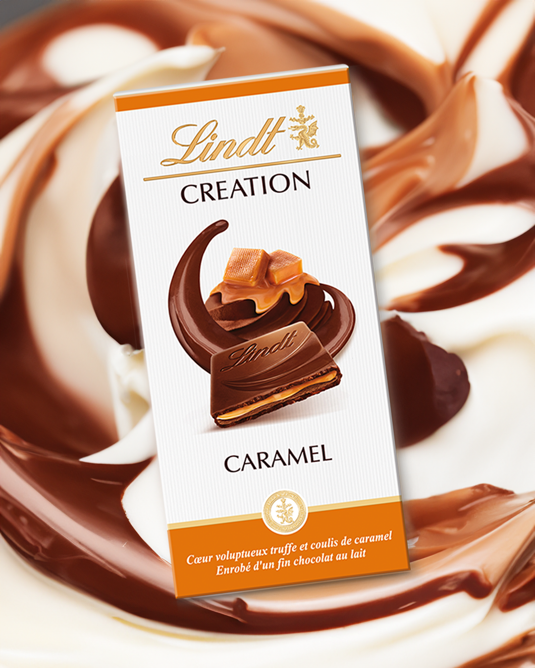 Indulge in Lindt Creation’s gourmet masterpiece: a decadent caramel coulis enveloped in rich milk chocolate, crafted from the finest ingredients for a luxurious treat anytime, anywhere.